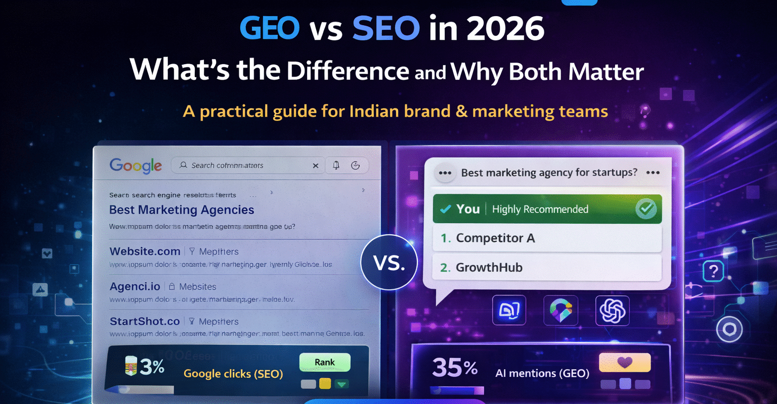 GEO (Generative Engine Optimisation) and SEO (Search Engine Optimisation) are related but fundamentally different disciplines. SEO gets your website onto Google's results page. GEO gets your brand named inside the AI-generated answer before anyone clicks. In 2026, you need both — and most Indian brands are only doing one.